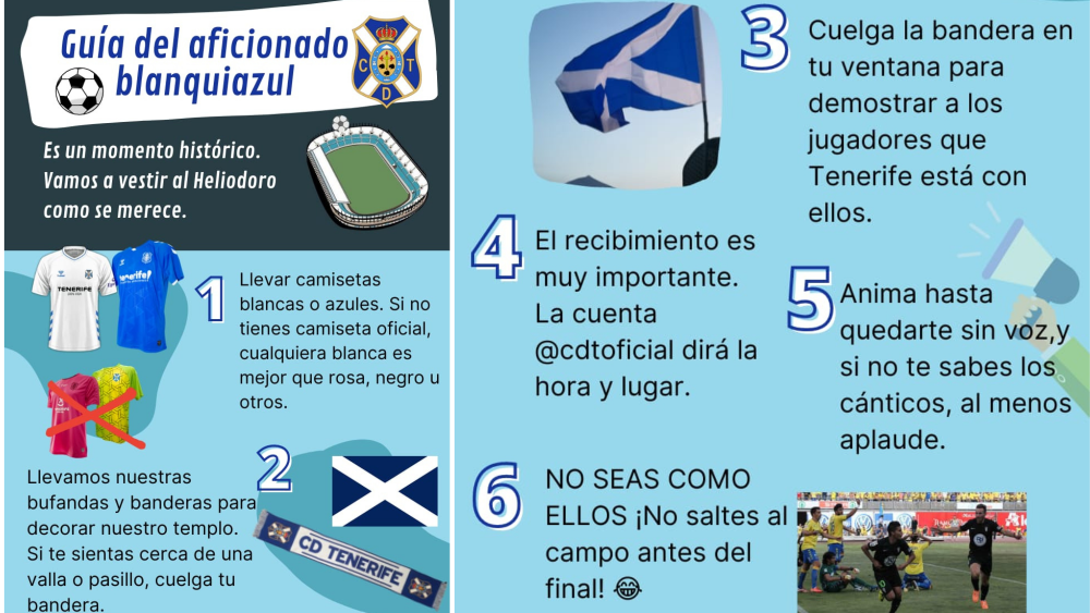 El aficionado que ha creado la guía se hace llamar Guayota en Twitter. En su lista de requerimientos para ser un buen aficionado del Tenerife este domingo, se encuentran otros cinco puntos. La primera consigna es llevar una camiseta azul o blanca y tratar de evitar colores como el rosa o el amarillo. Pide, además, llevar banderas y bufandas para decorar el estadio.