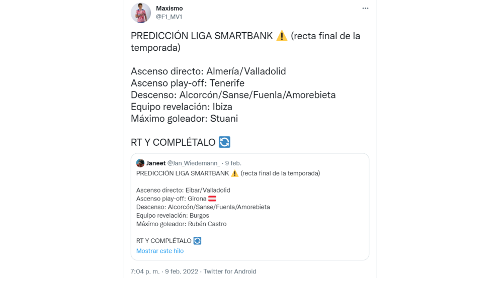 Este usuario se hace llamar "Maxismo" y el 9 de febrero lanzó sus apuestas respondiendo a una cadena viral. Los resultados por los que apostar eran muy concretos: ascenso directo, ascenso en 'playoff', descenso, equipo revelación y máximo goleador.