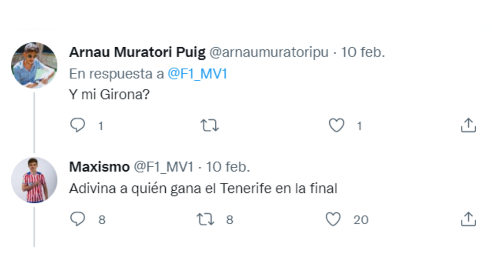 La apuesta de Maxismo pone también al Tenerife como ascendido en el 'playoff'. Aunque el tuit original no determina contra quién sería la final, las respuestas son esclarecedoras. "¿Y mi Girona?", le pregunta un usuario. "Adivina a quién gana el Tenerife en la final", responde categóricamente Maxismo. Tenerife y Girona son finalistas de la promoción tras vencer a Las Palmas y el Eibar en las semifinales.