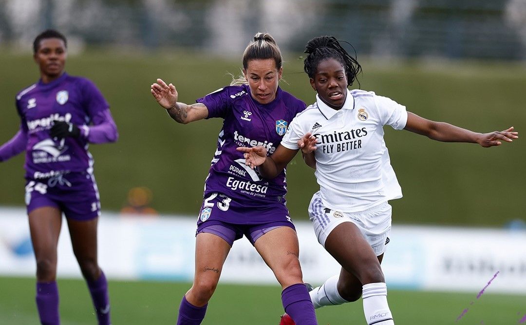 Bien plantado sobre el verde de Valdebebas, el cuadro visitante imponía su guión de partido. La posesión de balón de las locales apenas se traducía en peligro. Aún así las de Alberto Toril mejoraron su producción atacante en los quince minutos antes del descanso. Primero en un balón al borde del área que Nahikari no acertó a rematar y luego con un remate de cabeza de Weir que marchó por encima del travesaño. La delantera escocesa se activó y, en la siguiente acción, rompió la zaga tinerfeña regateando y se plantó frente a Aline Reis pero el lanzamiento salió alto.