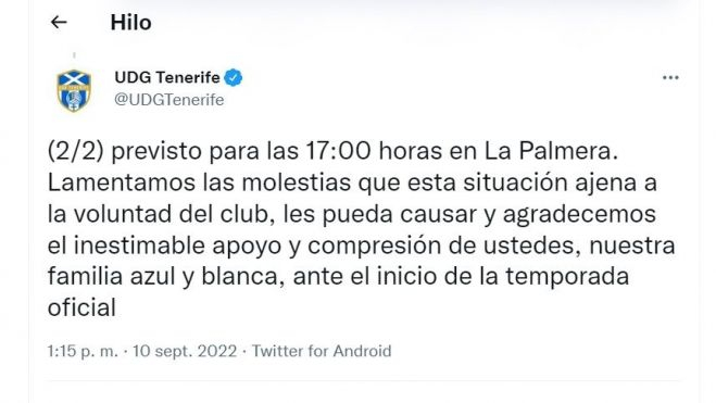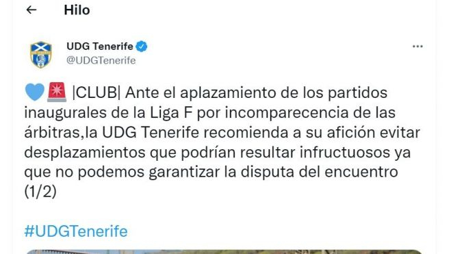 De esta forma, el estreno de la UD Granadilla ante el Athletic Club, previsto para las 17 horas de hoy sábado también deberá ser aplazado y desde la cuenta oficial de Twitter del club recomiendan a la afición no desplazarse al estadio de La Palmera, ya que la incomparecencia de las árbitras obliga a suspender el encuentro.