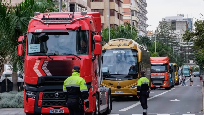 Entre las 10:00 y las 12:00 horas de este lunes, alrededor de 500 transportistas, incluyendo camiones, guaguas de pasajeros y taxis, recorrieron las calles de Canarias en una protesta organizada por la Federación de Empresarios de Transportes de Canarias (FET).