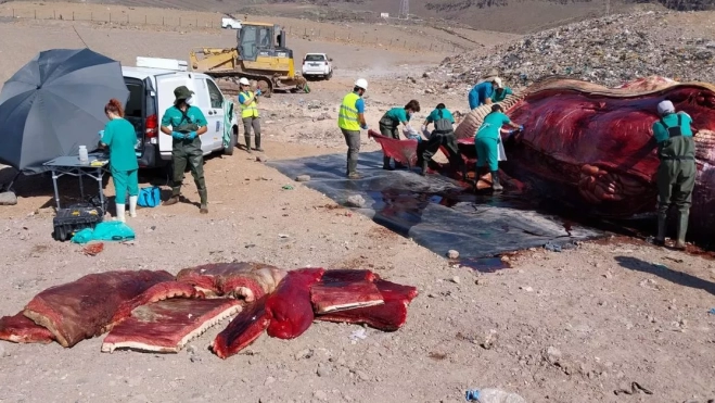 Una vez en el vertedero de Juan Grande, personal del IUSA (Instituto Universitario de Sanidad Animal y Seguridad Alimentaria) y de la SECAC (Sociedad para el Estudio de los Cetáceos en el Archipiélago Canario) le han practicado la necropsia a la ballena, que murió debido a un problema pulmonar grave, esto es, por causas naturales.