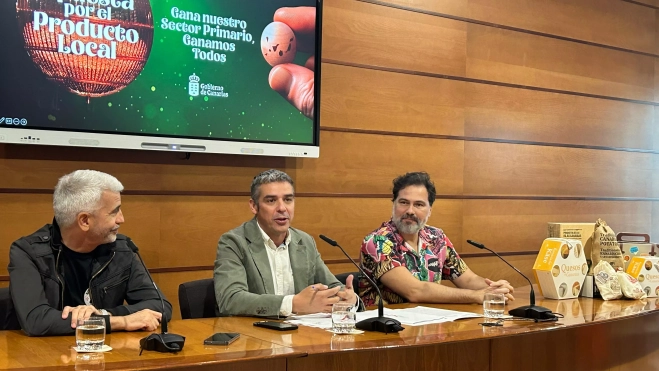 En la presentación de la campaña, titulada 'Apuesta por el producto local. Gana nuestro sector primario, ganamos todos', estuvo presente el consejero del Sector Primario, Narvay Quintero, junto a los humoristas canarios Jorge Hernández Galván y José Ramallo, miembros del grupo ‘El Supositorio’, que protagoniza la campaña.