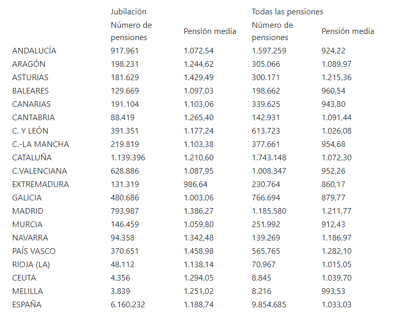 Como recogen diferentes informes sobre esta materia, el sistema español de pensiones no genera ningún tipo de discriminación territorial sino que más bien incorpora elementos de solidaridad, aunque estos no pueden compensar totalmente factores diferenciadores previos, relacionados con la demografía, el mercado de trabajo o los salarios.En el siguiente cuadro aparecen, por comunidades autónomas, el número de pensiones y la cuantía de la pensión media, tanto de jubilación como el total de modalidades, con datos del pasado mes de junio: