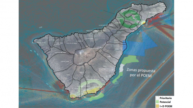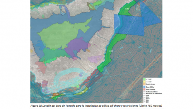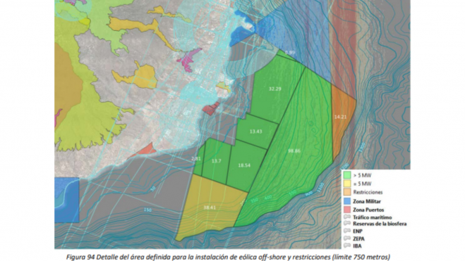“La zona de mayor potencial para la instalación de parques eólicos offshore se ubica en el Sureste de la isla con densidades de potencia eólica promedio de 750 W/m”, recoge el documento. Pero el poco espacio que permite la plataforma oceánica provoca que se tengan que tener en cuenta otras zonas más al norte con menos capacidad como Candelaria.