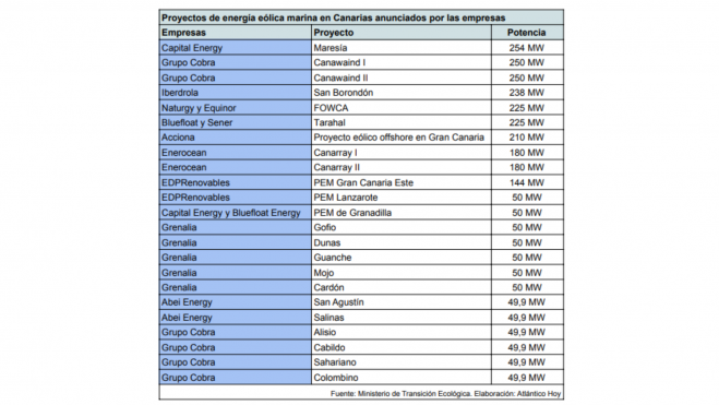 Abei Energy, Acciona, Capital Energy, Bluefloat, Grupo Cobra, Greenalia, Sener, Naturgy, Equinor, Iberdrola, Enerocean y EDPRenovables son las empresas que ya han presentado proyectos al Ministerio de Transición Ecológica. El de mayor potencia (Iberdrola) alcanzaría los 238 megavatios, frente a los menores que generarían 50 MW a través de cuatro aerogeneradores.