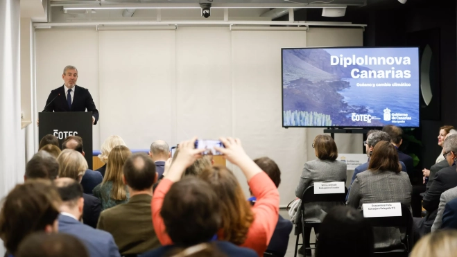 El presidente de Canarias, Fernando Clavijo, ha reivindicado este martes en Madrid el papel del Archipiélago como un nodo estratégico internacional para la investigación marina y la lucha contra el cambio climático. Durante la inauguración de la segunda edición del programa de diplomacia científica DiploInnova Canarias, celebrada en la sede de la Fundación Cotec, el jefe del Ejecutivo autonómico expuso ante representantes de 17 embajadas las capacidades de las islas para convertirse en un laboratorio mundial de protección de los océanos.