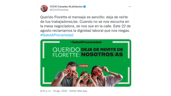 Por otra parte, sin nada organizado, de momento, y con el preaviso de huelga sobre la mesa están los trabajadores de Titsa. Intersindical Canaria ha presentado un preaviso de huelga a partir del 7 de septiembre ante lo que denuncia como varios incumplimientos del convenio colectivo, tanto en la asignación y cambio de centro de trabajo, como de servicios, líneas y horarios. Los empleados de la fábrica Florette en Gran Canaria también emitieron un aviso de huelga, aunque según han confirmado desde CCOO, tras un acercamiento en las negociaciones el preaviso ha quedado paralizado.