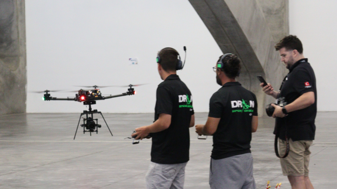 Tres trabajadores de empresas tecnológicas durante el vuelo de demostración de un dron. / ATLÁNTICO HOY
