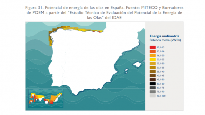 Respecto a la energía undimotriz, otro de los pilares en la hoja de ruta de la energía generada en el mar, el Gobierno destaca diferentes puntos en España para la producción energética a través del movimiento de las olas. La fachada norte de las Islas Canarias es uno de los tres puntos estratégicos para esta producción, con 20 kW/m. Galicia y el Mar Cantábrico serían las otras dos apuestas por parte del Gobierno para esta producción.