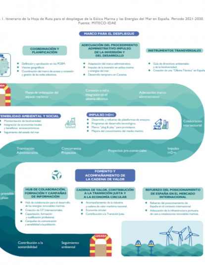 Anivel nacional se centra en cuatro grandes objetivos: Establecerse como polo de referencia europeo de I+D para el diseño, escalado y demostración de nuevas tecnologías; ser referente internacional en capacidades industriales, generando cadena de valor y empleo de calidad en todo el ciclo de vida de las tecnologías; integrar la sostenibilidad como pilar central del desarrollo de las energías renovables en el mar y desplegar de un modo ordenado las instalaciones, eólicas en particular, con una regulación clara y previsible, sobre tres elementos clave: ordenación espacial, conexión a red y modelo de negocio. Para el desarrollo de estos objetivos, se activarán al menos 200 millones de fondos públicos hasta 2023 para I+D en el marco del Plan de Recuperación, Transformación y Resiliencia (PRTR).