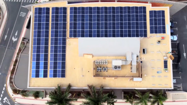 La instalación se encuentra en la azotea de la Escuela Municipal de Música de Adeje, y abastece con 99 kilovatios de energía a unos 200 contadores eléctricos que se encuentran en los 500 metros a su alrededor. Se trata de la propuesta Adeje Verde, puesta en marcha por el Ayuntamiento y liderado por el director del Máster de Energías Renovables de la Universidad de La Laguna, Ricardo Guerrero, quien asegura que este es un proyecto “que no hace nadie absolutamente en Canarias y probablemente sea la comunidad energética ciudadana más grande de toda España”.