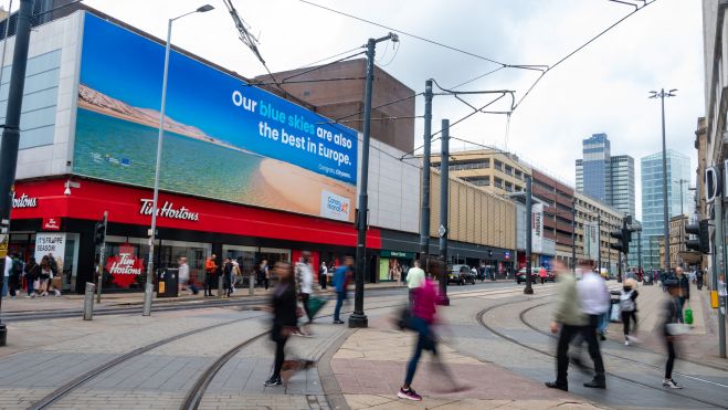 A través de una valla de grandes dimensiones, que estará ubicada durante 14 días frente a la principal calle de compras, Market Street, la Consejería utiliza un juego de palabras para felicitar al club y a su afición, conocidos como los skyblues -azul cielo- por su uniforme, recordándoles que las islas cuentan también con los mejores blue skies de Europa.