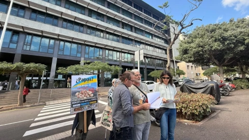 Varios colectivos sociales han presentado este miércoles una reclamación ante la Consejería de Agricultura, Ganadería, Pesca y Soberanía Alimentaria del Gobierno de Canarias para exigir la paralización de la comercialización de papa procedente de Israel en el Archipiélago. La acción, acompañada de una concentración frente a las instalaciones de la consejería en Santa Cruz de Tenerife, se desarrolló bajo el lema “¿Papas? Con mojo sí, con sangre no”.