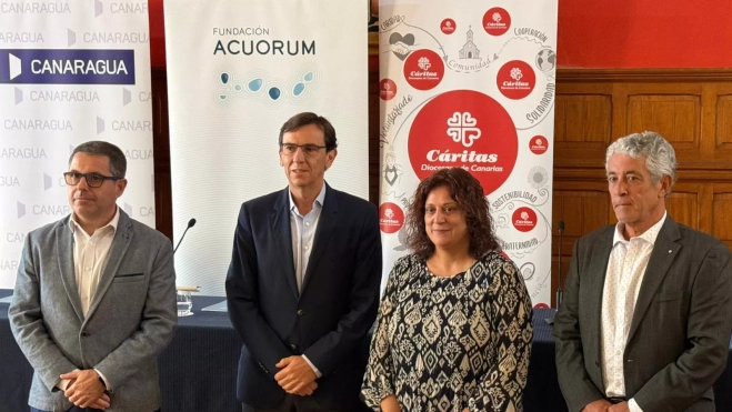 Durante la firma de los convenios, en un acto celebrado este miércoles en Las Palmas de Gran Canaria, participaron el vicepresidente de la Fundación Acuorum, José Sintes Sánchez; el representante de Canaragua, José J. Quesada Ruíz; la secretaria general de Cáritas Diocesana de Canarias, Caya Suárez Ortega; y el vicepresidente provincial de Cruz Roja en Las Palmas, Javier Sánchez Paz.
