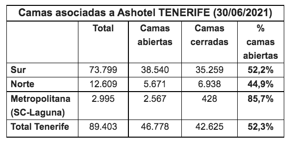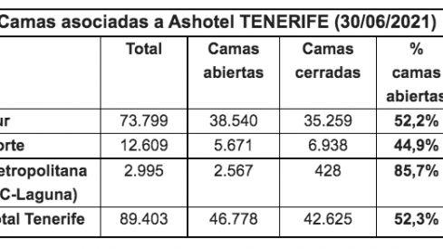 La patronal hotelera y extrahotelera de la provincia de Santa Cruz de Tenerife (Ashotel) prevé cerrar el mes de julio con el 65% de la planta alojativa de sus establecimientos asociados en Tenerife operativa.En Tenerife, el nivel de reapertura hotelera ha llegado al 55% en este mes de junio, mientras que en La Gomera y El Hierro los establecimientos asociados están abiertos en su totalidad, y en La Palma están operartivas el 65% de las camas asociadas.De los 206 establecimientos alojativos asociados a Ashotel en Tenerife 114 ya están abiertos.Por zonas, el sur de la isla tiene el 55,5% ya operativo, el norte, el 46,5%, y la zona metropolitana, el 73,6%.Mientras, por camas turísticas, los porcentajes son los siguientes: sur de Tenerife (52,2%), norte (44,9%) y zona metropolitana (85,7%).Para este mes de julio está prevista la reapertura en Tenerife de 20 establecimientos alojativos asociados, lo que elevaría la tasa de reapertura al 65% en la isla.