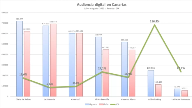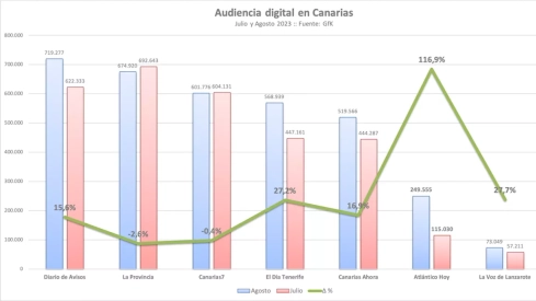 El ranking digital canario lo encabezó en agosto Diario de Avisos, el centenario rotativo tinerfeño. Su edición digital obtuvo 719.277 lectores de Canarias. A continuación le sigue La Provincia, que totalizó 647.920 lectores, y Canarias7, que reunió en agosto a 601.776 seguidores. Estos dos medios registraron leves descensos de audiencia con respecto a los datos de julio pasado.