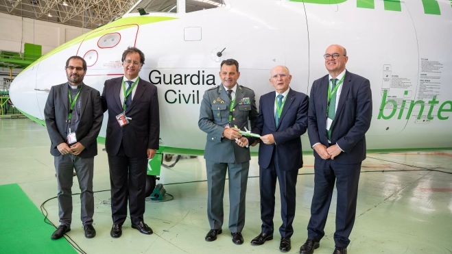 Binter ha rendido este martes homenaje a la Guardia Civil con el bautizo de uno de los aviones, modelo ATR 72-600, con el nombre de este cuerpo de seguridad.