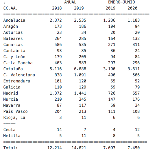 Ya en este año, y con datos del primer semestre, se observa una ralentización en las ocupaciones, pero siguieron subiendo a pesar de las restricciones a la movilidad que se impusieron durante el estado de alarma en toda España desde mediados de marzo hasta casi finales de junio, cuando comenzó la desescalada.Cinco comunidades autónomas registraron subidas en este primer semestre, con Galicia a la cabeza en los incrementos porcentuales, con un alza del 33,9 por ciento, por delante de Murcia (19,7 %), Canarias (14,7 %), Comunidad Valenciana (14,1 %) y Cataluña (13,2 %).El siguiente cuadro recoge, por comunidades autónomas, el número de ocupaciones ilegales de vivienda en 2018 y en 2019 y en el primer semestre de 2019 y de 2020, según la respuesta del Gobierno: