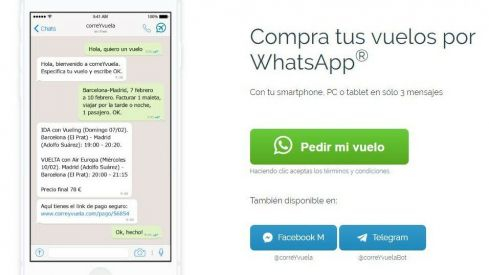 Añada el contacto de CorreYvuela (disponible en su web) a WhatsApp, Facebook o Telegram, escriba el saludo “hola” y una plantilla le guiará para comprar los billetes de avión en menos de diez minutos. En caso de que esté interesado solo debe confirmar la operación contestando “okey” y le enviarán el enlace para realizar el pago de forma segura.