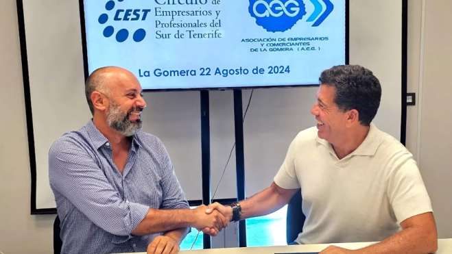 El Círculo de Empresarios y Profesionales del Sur de Tenerife (CEST) y la Asociación de Empresarios y Comerciantes de La Gomera (AEG) han firmado este viernes un convenio para la colaboración empresarial entre ambas entidades. La intención es trabajar de forma conjunta en la búsqueda de nuevas oportunidades de negocio para las empresas de ambas islas y aumentar su vínculo a través de actividades de cooperación, según ha informado el CEST en un comunicado.