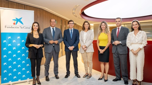 El acto de firma de esta colaboración ha contado con la presencia del vicepresidente de la Fundación Acuorum, José Sintes, y su gerente, Soledad Iess, así como del director territorial de CaixaBank en Canarias, Manuel Afonso, junto a miembros del equipo directivo de la entidad.