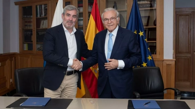 El presidente del Gobierno de Canarias, Fernando Clavijo, y el de la Fundación laCaixa, Isidro Fainé, firmaron este lunes el acuerdo marco que recoge esta colaboración institucional en materia social, educativa, cultural y científica.