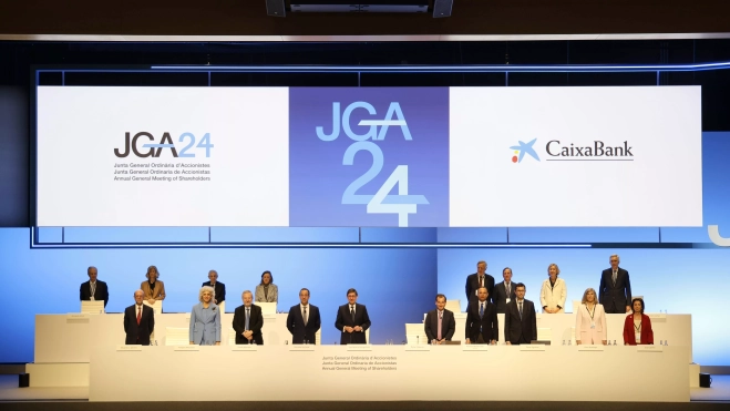 La Junta General Ordinaria de Accionistas de CaixaBank ha aprobado todos los acuerdos sometidos a votación, entre los que se encuentra el abono de un dividendo de 0,3919 euros por acción con cargo a los resultados de 2023, lo que supone un incremento del 70% frente a los 0,2306 euros del ejercicio anterior.