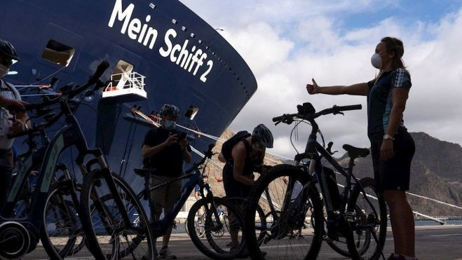 Durante el trayecto de Arrecife (Lanzarote) a Santa Cruz el hombre, de unos 35 años de edad, ha celebrado, además, el cumpleaños de su mujer. Y juntos se alejan poco después, tras escuchar las indicaciones del guía, rumbo a su visita por la ciudad.Todos los pasajeros coinciden en lo "magnífica" que está siendo la experiencia, sobre todo porque los protocolos sanitarios y de seguridad son "muy exigentes", lo que "nos hace sentir seguros", añade Selene, otra cicloturista.En este sentido, Mark Pilser, monitor de una de las excursiones en bicicleta hasta Las Teresitas, señala que "había ganas de viajar", y en especial de las rutas guiadas por tierra. "Hasta ahora solo estábamos ofreciendo viajes por mar", explica.Aún así, y como consecuencia de las restricciones actuales, los pasajeros solo podrán salir del barco a través de las excursiones programadas, y tampoco podrán pararse a descansar o a tomar algo en terrazas y restaurantes."Solo comida para llevar", explica Selene, quien, no obstante, sigue siendo positiva, pues al final "significa más seguridad", concluye.Con motivo de esta "histórica llegada", la Autoridad Portuaria organizó un recibimiento simbólico al buque, al que asistieron el presidente del Cabildo de Tenerife, Pedro Martín; el alcalde de Santa Cruz, José Manuel Bermúdez; y el presidente de la Autoridad Portuaria, Carlos González.📽️ @avtorresp inaugura la temporada de #cruceros con el Mein Schiff 2, primer buque en retomar la actividad en España, viajando entre las Islas con test en origen a sus pasajeros: "Esta noticia es motivo de alegría en estos momentos difíciles". pic.twitter.com/c8yUYv8rzx