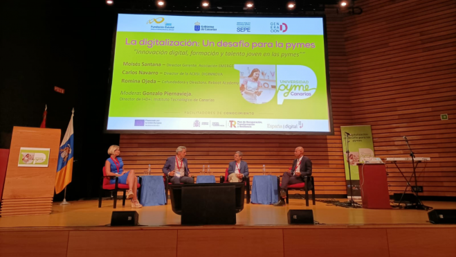 Santana también estuvo presente en el evento Universidad Pyme Canarias. Participó en una mesa redonda junto a Romina Ojeda, cofundadora y directora de Reboot Academy; y Carlos Navarro, director general de la Agencia Canaria de la Investigación, Innovación y Sociedad de la Información del Gobierno regional (ACIISI).