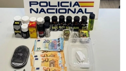 Durante el operativo se intervinieron 25,6 gramos de cocaína, 103,70 gramos de hachís, un gramo de MDMA, 14 frascos de popper y dos envases de fármacos ansiolíticos, además de 900 euros en billetes fraccionados.