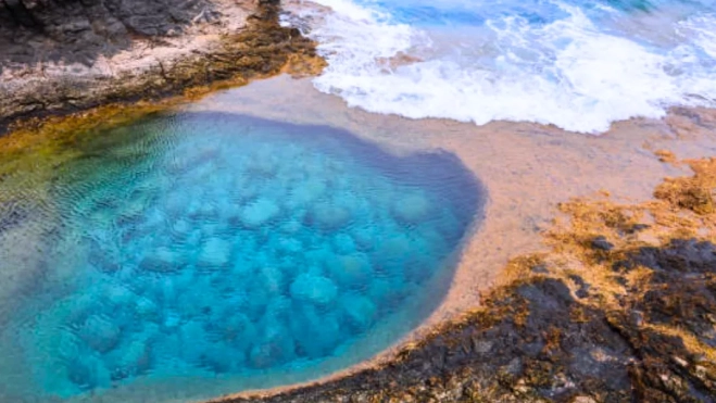 “Lo más curioso es que desaparece en cuanto sube el mar”. Así describen los vecinos de Caleta de Fuste una de las joyas más desconocidas de Fuerteventura: una piscina natural formada por rocas basálticas que solo se deja ver durante la marea baja. Cuando el Atlántico retrocede, el agua cristalina queda atrapada entre paredes volcánicas negras, creando un paisaje difícil de olvidar en Canarias.