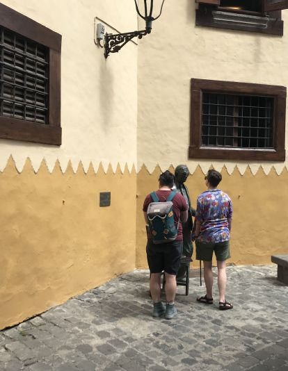 Cada ciudad tiene unas esculturas para los abrazos y las fotografías, imágenes ante las que los turistas se detienen a poner caras graciosas o a eternizarse echando su brazo sobre el hombro de quien casi nunca conoce. En Las Palmas de Gran Canaria sucede con la escultura de Néstor Álamo que está junto a la Casa de Colón, a escasos metros de la fachada de la casa colombina, que diseñó Néstor, ante la que también se retratan cientos de turistas cada día creyendo que esa iconográfica recreación simboliza la estética ornamental de la isla.