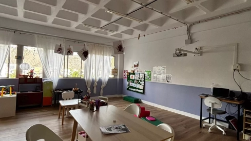 Para la adecuación del Aula Enclave, se instaló un pavimento de linóleo, que permite proporcionar mayor comodidad y seguridad para el alumnado que la ocupa, ya que gran parte de su actividad se realiza en el suelo. Además, las paredes fueron revestidas parcialmente con este mismo material, ya que facilitan la absorción de posibles impactos y proporcionan un entorno más cálido al espacio. Para amoldar el entorno, también se adaptó un baño cercano al aula, incorporando un inodoro y lavabo accesibles, así como una ducha con agua caliente y espacio para camilla.