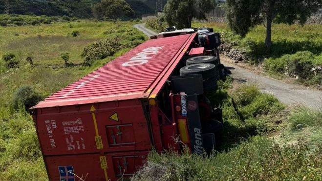 Un aparatoso accidente de tráfico registrado en la mañana de este lunes 2 de marzo en la carretera GC-130, conocida como carretera de Los Picos, en el municipio de Telde, se saldó con un hombre herido leve tras el vuelco de un camión que transportaba 50 toneladas de material de construcción, una carga cuyo valor se estima en alrededor de 50.000 euros.