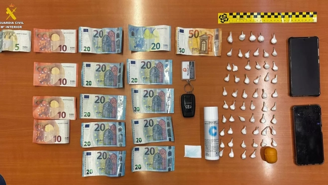 Este comportamiento despertó las sospechas de los efectivos, que procedieron a un registro superficial. En el interior del vehículo, localizaron una bolsa con múltiples monodosis (en la imagen compartifa por la Guardia Civil se contabilizan 57) de una sustancia en polvo blanco que desprendía un fuerte olor químico. El análisis posterior confirmó que se trataba de cocaína. Además, se incautaron varios billetes fraccionados y dos teléfonos móviles, indicios habituales de tráfico de estupefacientes a pequeña escala.
