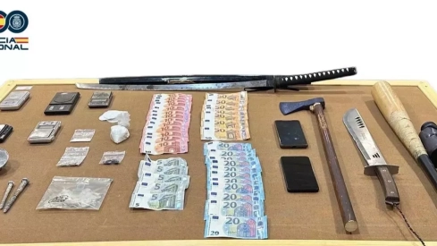 En este caso se intervinieron 45 gramos de cocaína, otros 35 gramos de crack, dinero y varias armas peligrosas, entre ellas una katana, un hacha y un machete, además de básculas de precisión y material para cortar o preparar la mercancía para su distribución.
