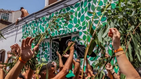 Con banderillas, precisamente, se hizo la intervención del año pasado. La iniciativa se ha consolidado entre los actos de la fiesta, como revela el éxito de 2022, con el eco de la pandemia aún de fondo y un sinfín de hojas verdes estampadas en la pared que daba gusto solo mirarlas.