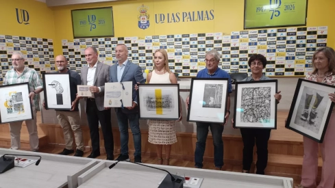 El presidente de la Unión Deportiva Las Palmas, Miguel Ángel Ramírez, y la Consejera de Cultura del Cabildo de Gran Canaria, Guacimara Medina, acompañados del vicepresidente de la Fundación UD Las Palmas, Rafael Méndez, presentaron en la mañana de hoy viernes, día 16 de agosto, la carpeta de grabados conmemorativa del 75 Aniversario del citado club, editada para la ocasión en la que han participado los seis artistas Ángel Arencibia, Giuliana Conte, Lidia Esther Díaz, Leopoldo Emperador, Mariví Gallardo y Miguel Panadero.