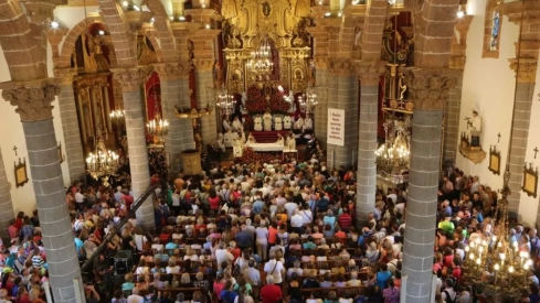 Más allá de su impactante fachada, el interior de la basílica es un verdadero tesoro. El retablo de la capilla mayor, costeado por la familia Carvajal y Matos, es una de las muestras más bellas del rococó en la isla, obra de los maestros retablistas José de San Guillermo y Nicolás Jacinto Viera. Sus columnas doradas y detalles minuciosos llevan la vista del espectador hacia el altar, donde descansa la pieza más venerada del templo.