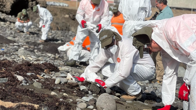 En cuanto a la situación en la playa de Bocabarranco, en esta zona las manchas de combustible son más dispersas y están localizadas entre las rocas del litoral, lo que dificulta su retirada y complica su limpieza al realizarse piedra a piedra.