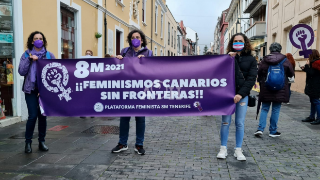 Las calles de San Cristóbal de La Laguna también se han teñido ligeramente de violeta este lunes 8 de marzo tras la concentración celebrada esta tarde con motivo de la celebración del Día Internacional de la Mujer Trabajadora, en la que participaron decenas de personas manteniendo las medidas de seguridad aconsejadas por las autoridades.Ni la lluvia ni la pandemia han conseguido desanimar a los participantes en una concentración en la que los asistentes mantuvieron la distancia de dos metros aconsejada entre los propios participantes, además de hacer uso de la mascarilla. Los asistentes a la concentraron se colocaron en tres filas que recorrían las principales calles de la ciudad.En la concentración, que se vio afectada también por la lluvia, se escucharon enseñas como "Arriba el feminismo que va a vencer y abajo el patriarcado que va a caer", "De este a oeste la lucha sigue cueste lo que cueste" o "mi cuerpo es mío y yo decido".
