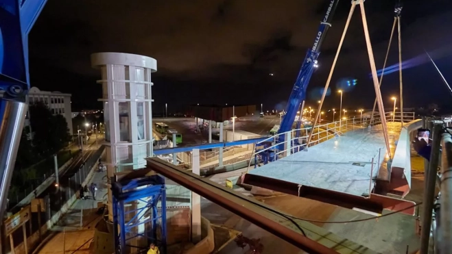 La pasarela de Padre Anchieta avanza muy poco a poco en su construcción y parece que estará lista finalmente en febrero de 2026, con casi cuatro años de retraso. Ahora, ell área de Carreteras del Cabildo de Tenerife ha comenzado a instalar dos de los módulos de conexión entre el anillo de la pasarela peatonal del Padre Anchieta con el intercambiador de La Laguna, uno de ellos el más largo de los siete instalados, con 35 metros de longitud y 50 toneladas de peso.