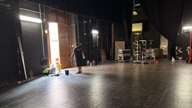 En lo que se refiere a la caja escénica principal, se está procediendo a la sustitución de los telones principales y al pintado y acondicionamiento general del escenario, que ha sufrido algunos daños por los cambios de escenario y acciones cotidianas propias de cualquier representación teatral.