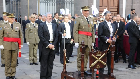 El teniente general jefe del Mando de Canarias, Julio Salom Herrera, presidió este domingo la ceremonia que dio paso a los actos en honor al Cristo de La Laguna. Estuvo acompañado por autoridades civiles y militares, entre ellas, el presidente del Gobierno de Canarias, Fernando Clavijo, y el alcalde de La Laguna, Luis Yeray Gutiérrez.