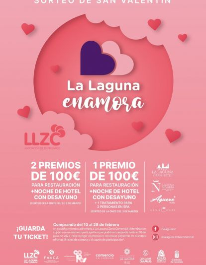Las Zonas Comerciales Abiertas del Casco Histórico de La Laguna, La Cuesta y Taco han puesto en marcha la campaña de promoción La Laguna Enamora con motivo de San Valentín y que, desde hoy y hasta el 28 de febrero, ofrecerá cupones con cada compra en los comercios y establecimientos de restauración adheridos para el sorteo de tres premios, que consistirán, cada uno, en un vale de 100 euros para consumir en los bares y restaurantes y en una noche de hotel con desayuno, así como un primer premio que también sumará una sesión de spa para dos personas. La Concejalía de Comercio de La Laguna, que dirige María José Roca, colabora en esta iniciativa, con la que se quiere fomentar las compras y atraer a consumidores al municipio, y a la que también se han sumado diversos establecimientos de restauración de la localidad que, durante esta semana, ofrecerán menús especialmente diseñados para esta celebración.