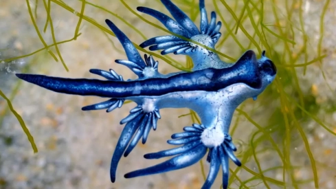 El dragón azul mide entre tres y cuatro centímetros de largo, tiene un color azul muy vistoso y seis apéndices en los que acumula el veneno.