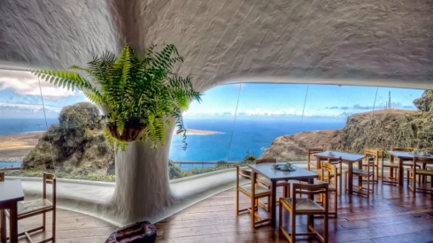 Al cruzar su entrada serpenteante, dos ventanales abovedados actúan como ojos que se abren al paisaje: La Graciosa, Montaña Clara, Roque del Este, Roque del Oeste y Alegranza se alinean sobre un Atlántico de azul inabarcable. Desde la terraza superior, el espectáculo se multiplica, especialmente en días nublados, cuando el "mar de nubes" añade una atmósfera de otro mundo.