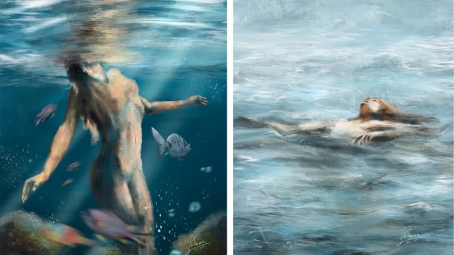 "La inmensidad del mar", continúa Montesdeoca, "como expresión de la ansiada libertad, se intensifica por los cuerpos que parecen levitar en un eterno azul. En todo caso, el significado propuesto por la autora refleja la mirada panteísta que parece derivar de presupuestos adscritos al simbolismo. Al fin y al cabo, nuestro pasado, y el anhelado futuro, provienen del origen femenino de lo acuático, emblema de la fertilidad y la vida. No en vano es uno de los cuatro elementos primordiales de la alquimia y de cualquier cosmogonía. Todo comienza y acaba en el insondable líquido, distrito de la vida y la muerte. Ya lo dijo Herman Melville en su Moby Dick, 'El corazón del hombre es como un océano, lleno de misterios y profundidades inexploradas'”, puntualiza.